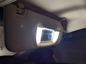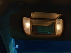 I replaced the dim vanity mirror light bulbs with brighter white LED bulbs. If you do this, I recommend that you use a plastic pry tool to remove the old bulbs because if you use a little metal screwdriver as I did, and if you touch the metal contacts with it as I did, you’re probably going to blow a fuse. As I did.