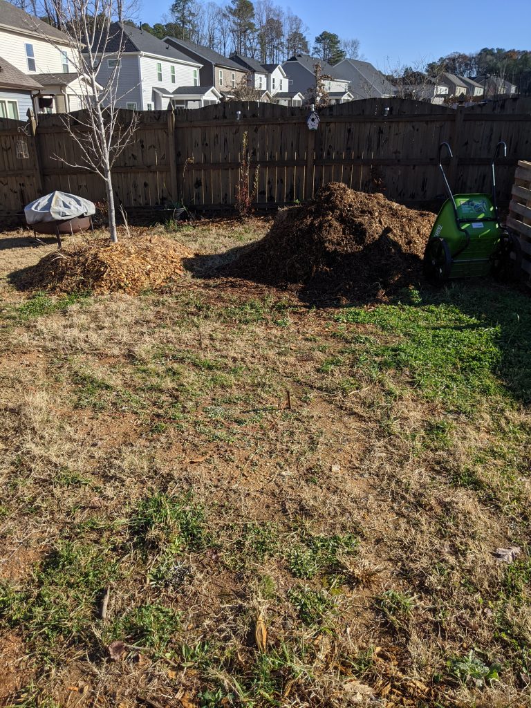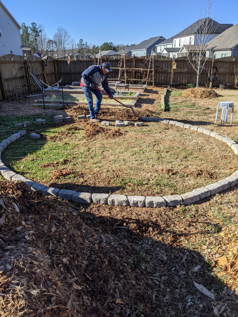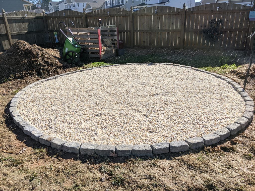 With the help of a railroad spike, some orange string, two pencils and a rubber band, we marked out a 14′ diameter circle. We asked Slinging Grass Landscaping to build out the area. With Covid, our material choices were limited, so after some back and forth, we settled on what you see in the photos. We didn’t have any other stone accents in the yard, so matching an existing style wasn’t a concern.